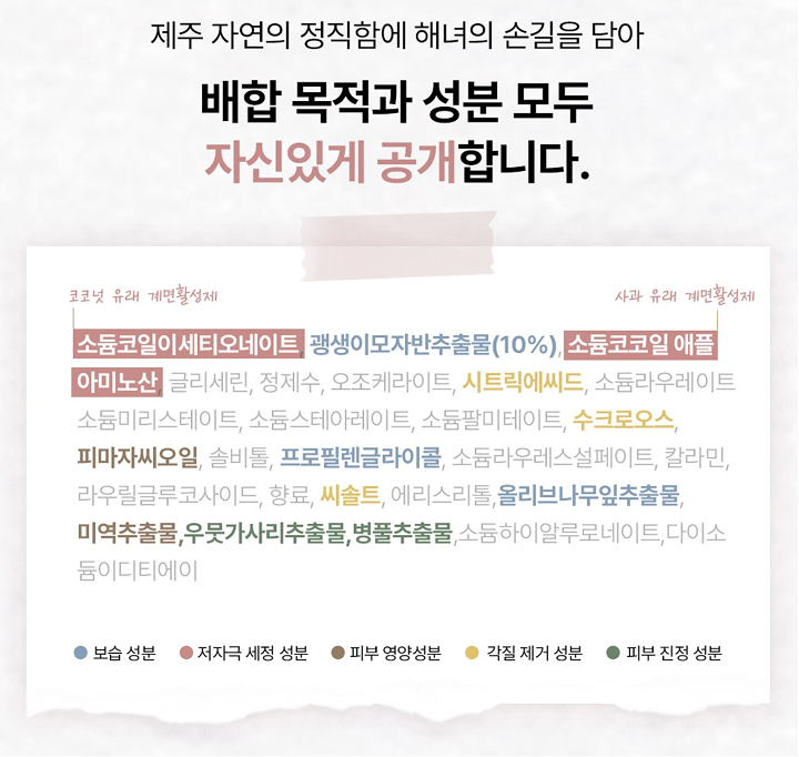 또한 글리세린, 괭생이모자반추출물, 피마자오일, 올리브잎추출물, 미역추출물등 보습과 진정에 유익한 성분이 풍부해 세정 후 피부 당김을 줄이고 수분 손실을 최소화할 수 있습니다. 이처럼 자연에서 유래한 해조류 기반 성분 조합은 피부 장벽을 보호하면서도 부드러운 세정력을 선사합니다.